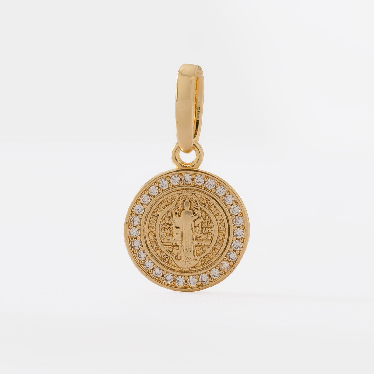 El dije San Benito con circonias combina la poderosa protección del santo con el lujo de las gemas brillantes. Escudo sagrado con elegancia premium.
